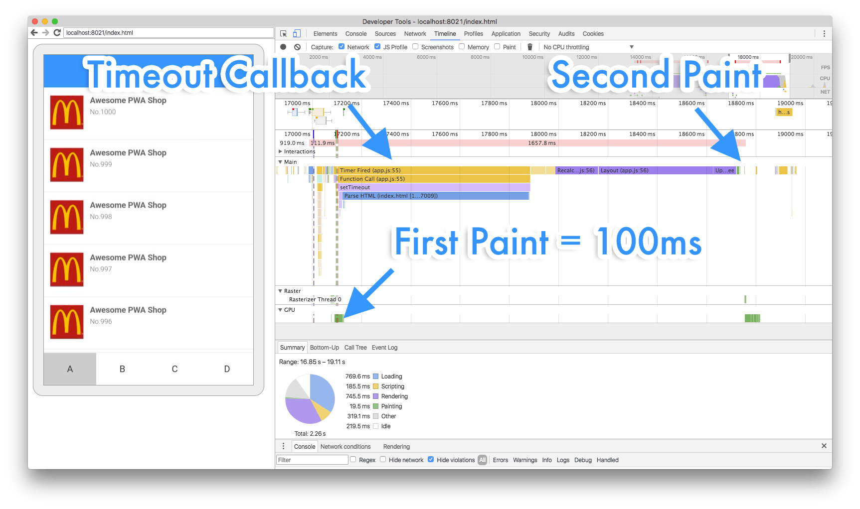 而更重要的是,一个不阻塞 HTML 解析的脚本仍然可能阻塞到绘制。我做了一个简化的“最小多页 PWA”(Minimal Multi-page PWA,或 MMPWA)来测试这个问题,:我们在一个 async(且确实不阻塞 HTML 解析)脚本中,生成并渲染 1000 个列表项,然后测试骨架屏能否在脚本执行之前渲染出来。下面是通过 USB Debugging 在我的 Nexus 5 真机上录制的 profile: